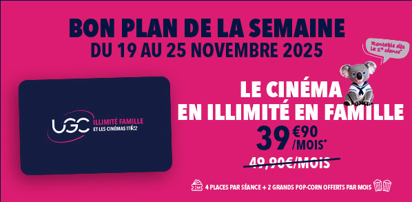 Plutôt sympathique le « bon plan de la semaine » d’UGC valable du 19 au 25 novembre. La carte illimitée « Famille » est proposée au prix mensuel de 39,90 euros au lieu de 49,90 €, avec 30 € de frais de dossier et le prorata du mois en cours en supplément. Cette carte permet à son titulaire d’être accompagné, à chaque séance, d’un à trois invités. L’engagement est d’un an minimum.