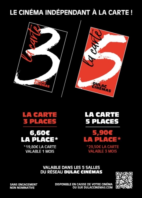 Maison Dulac Cinéma lance deux nouvelles cartes, de 3 et 5 places, valables dans ses cinq cinémas parisiens (L’Arlequin dans le 6ᵉ, Le Reflet Médicis dans le 5ᵉ, L’Escurial dans le 13ᵉ, Le Majestic Bastille dans le 11ᵉ et Le Majestic Passy dans le 16ᵉ), a annoncé le groupe, jeudi 19 février. L’objectif est de proposer « une formule plus libre, flexible et accessible, pensée pour tous les rythmes de spectateurs ».